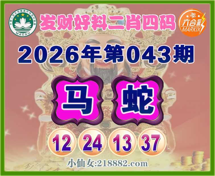 043期:【发财好料】 👩‍🌾二肖四码👩‍🌾【马】【12.24.13.37】开:蛇13